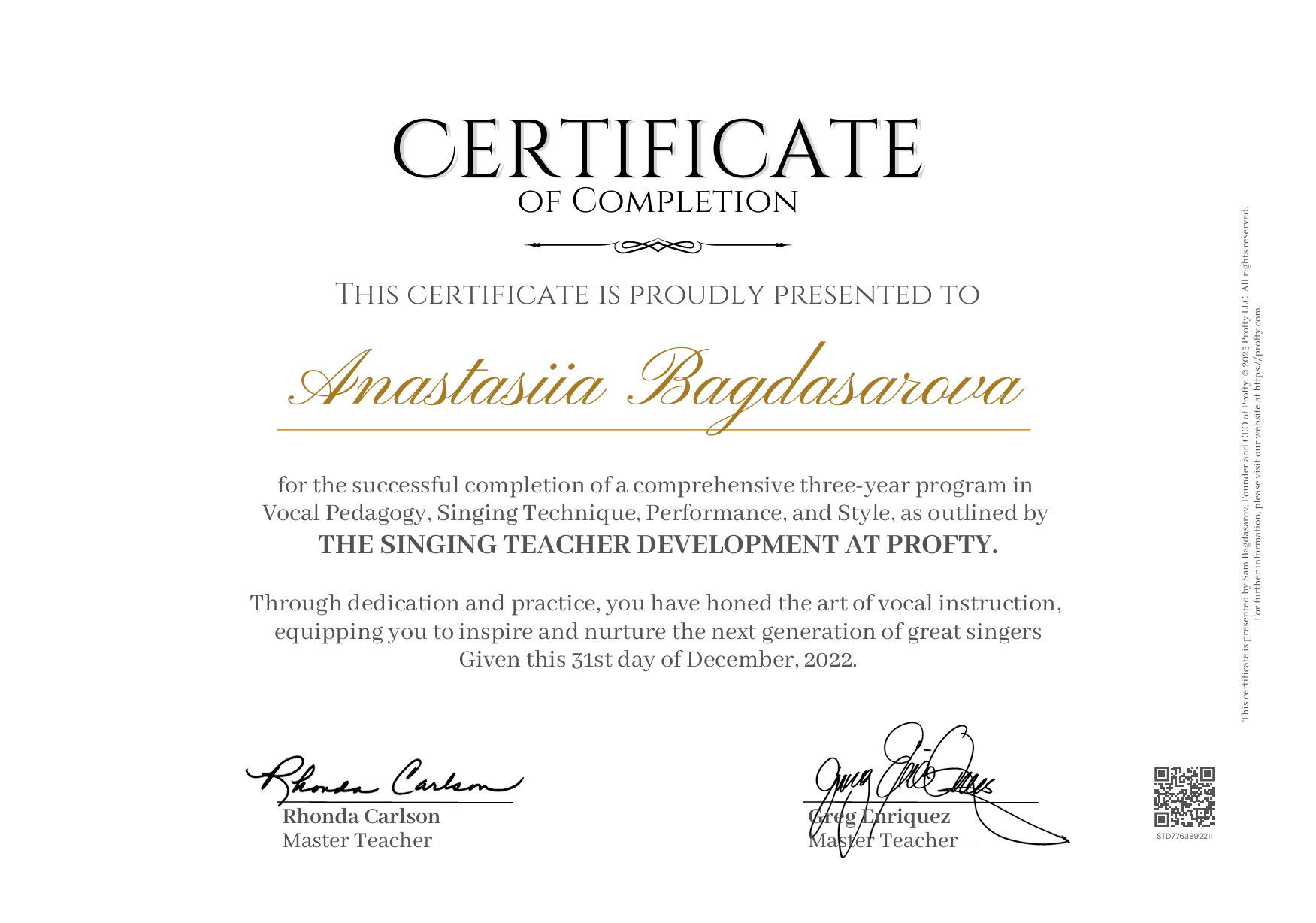 Ученица лучших педагогов из США, обучивших артистов - обладателей премий «Оскар», «Грэмми», «Золотой Глобус» (Рааб Стивенсон, Грег Энрикес, Ронда Карлсон, Моник Томас, Роджер Лав, Венди Парр)